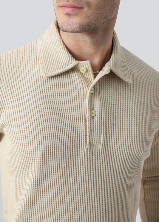 Waffle Knit Full Sleeves Regular Fit Polo-Beige